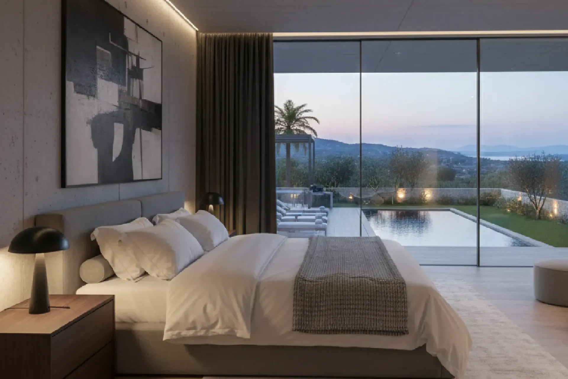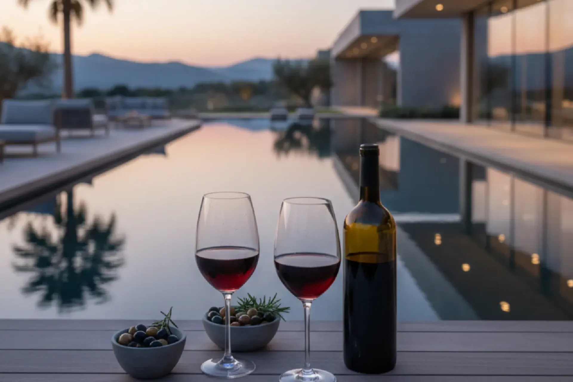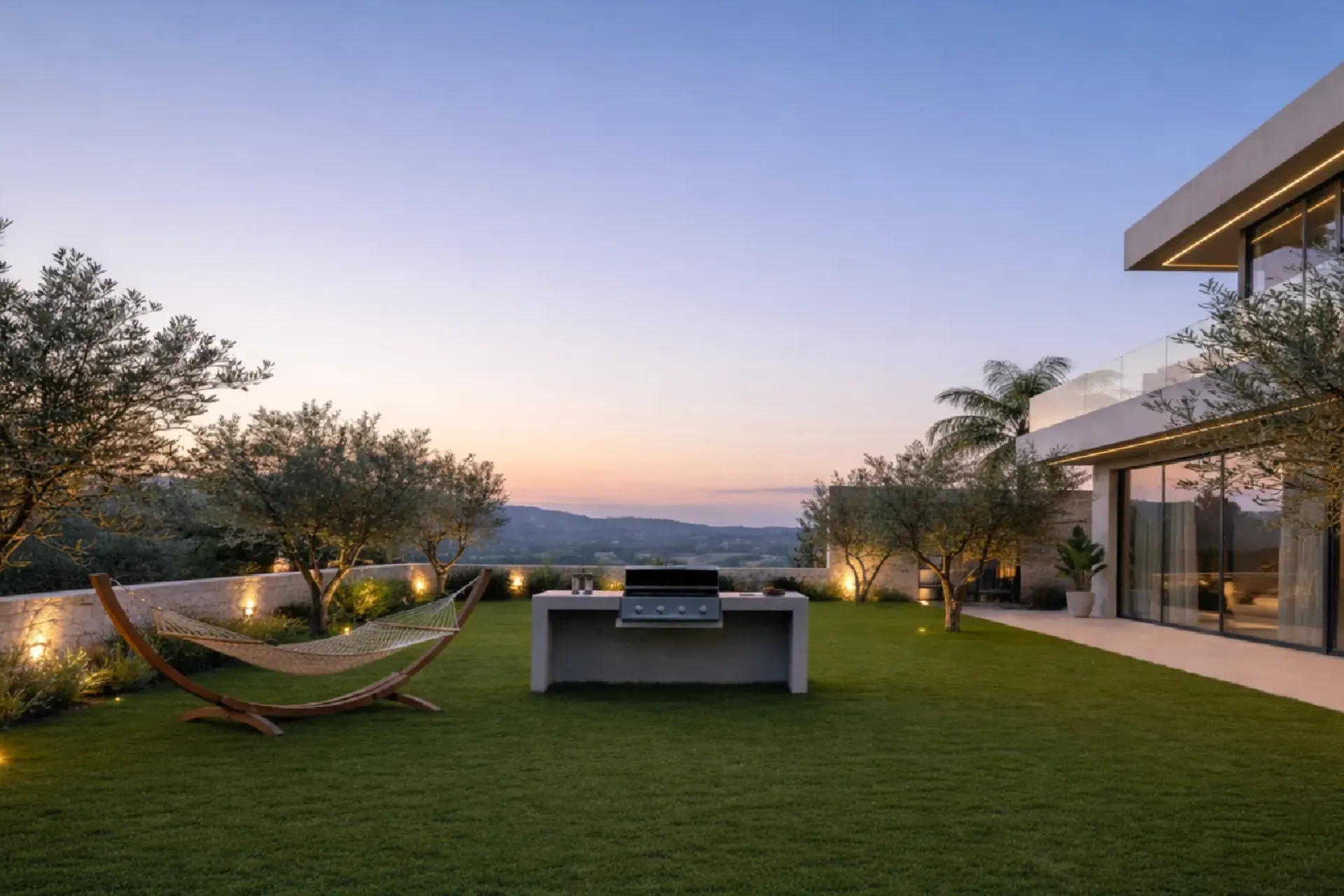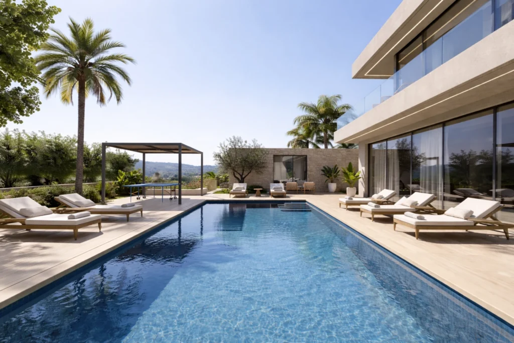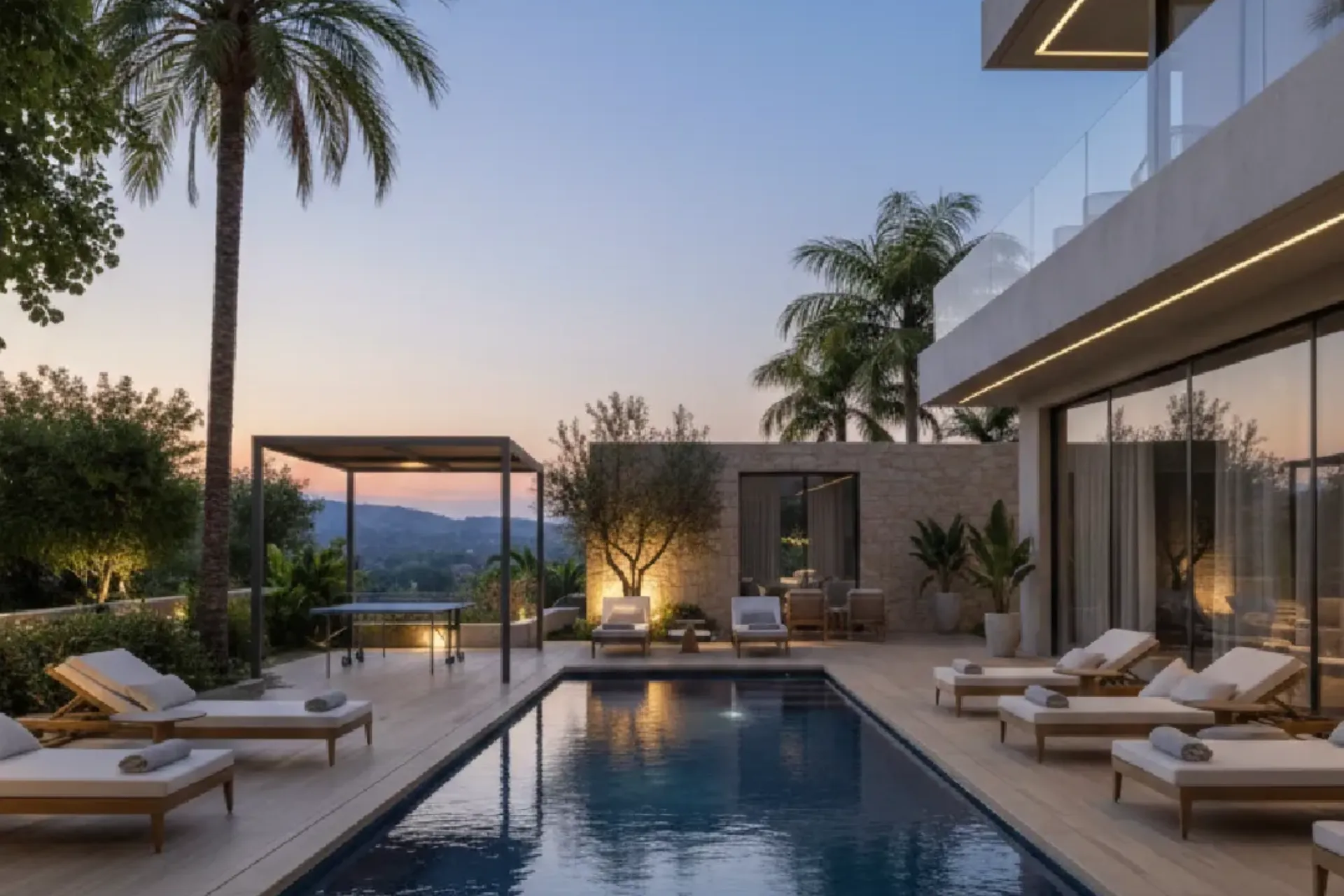 מתחם חוץ מושקע עם בריכה ואזור ישיבה
